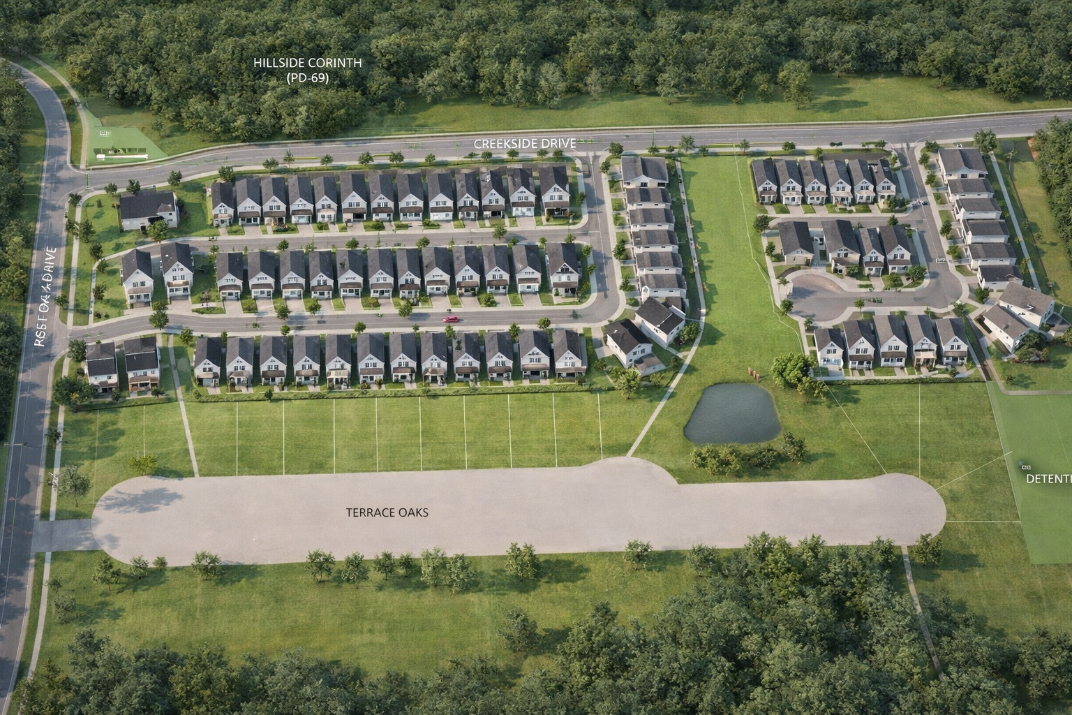 Saddlebrook is an upcoming community of 97 beautifully designed, detached single-family homes in Corinth, offering thoughtfully crafted 30’ and 45’ homesites with move-in-ready opportunities anticipated by the end of 2026. Inspired by modern farmhouse architecture that honors the land’s rich history, each home features inviting front porches and alley-loaded garages to create a charming, pedestrian-friendly streetscape.